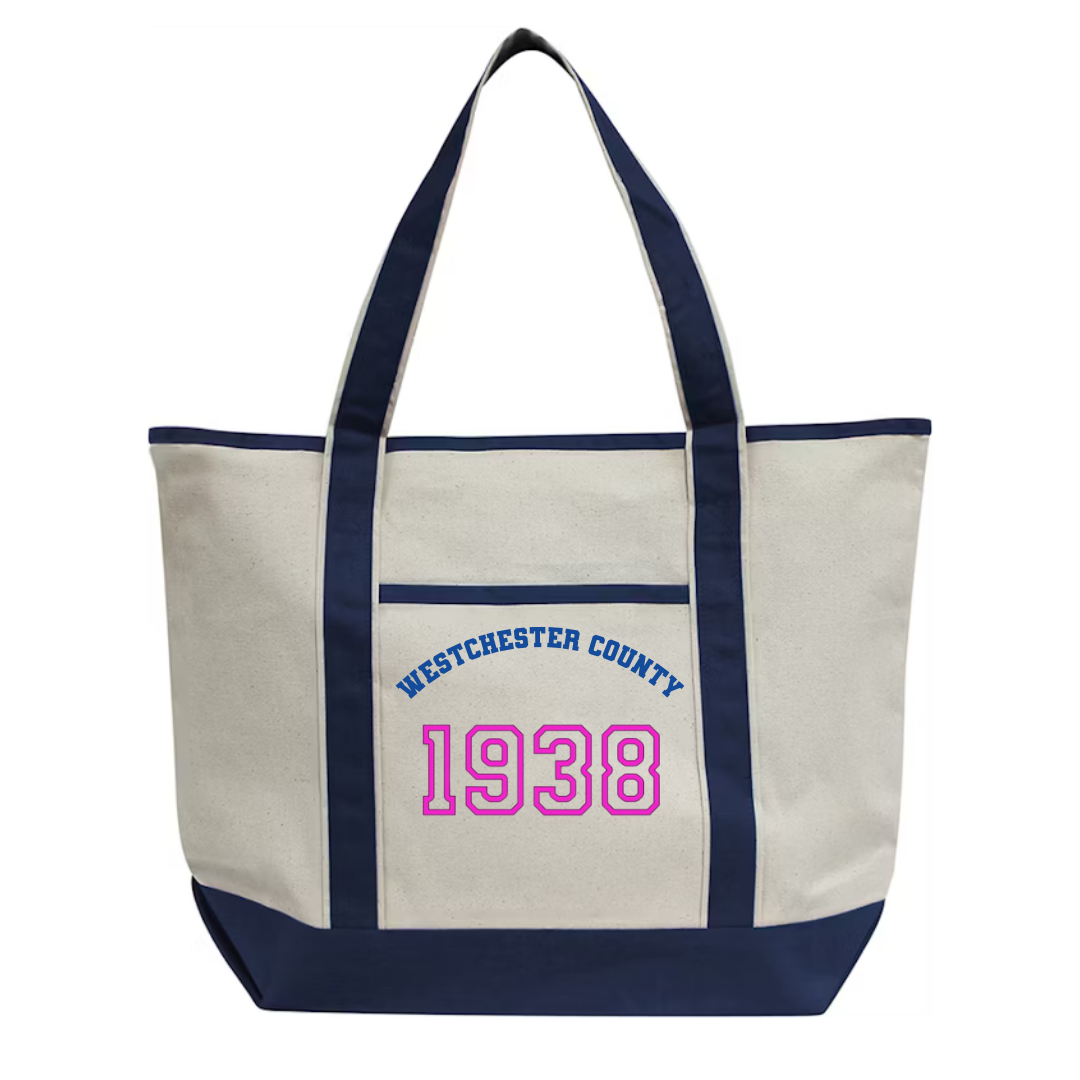 Elevate your style with our stylish Chic Canvas Tote Bag. Crafted from 12 oz. cotton canvas, this bag features 28" handles with a 10" drop, making it easy to carry on your shoulder or by hand. The beige canvas is accented with navy blue straps and trim for a sophisticated look. The exterior front pocket and interior zippered pocket offer convenient storage options for your essentials. With a spacious 22" x 16" x 6" size, this tote bag is perfect for daily use, work, or shopping. Stand out with the unique design featuring your chapter and 1938' in navy blue and pink hues. Take your style to the next level with our Chic Canvas Tote Bag!